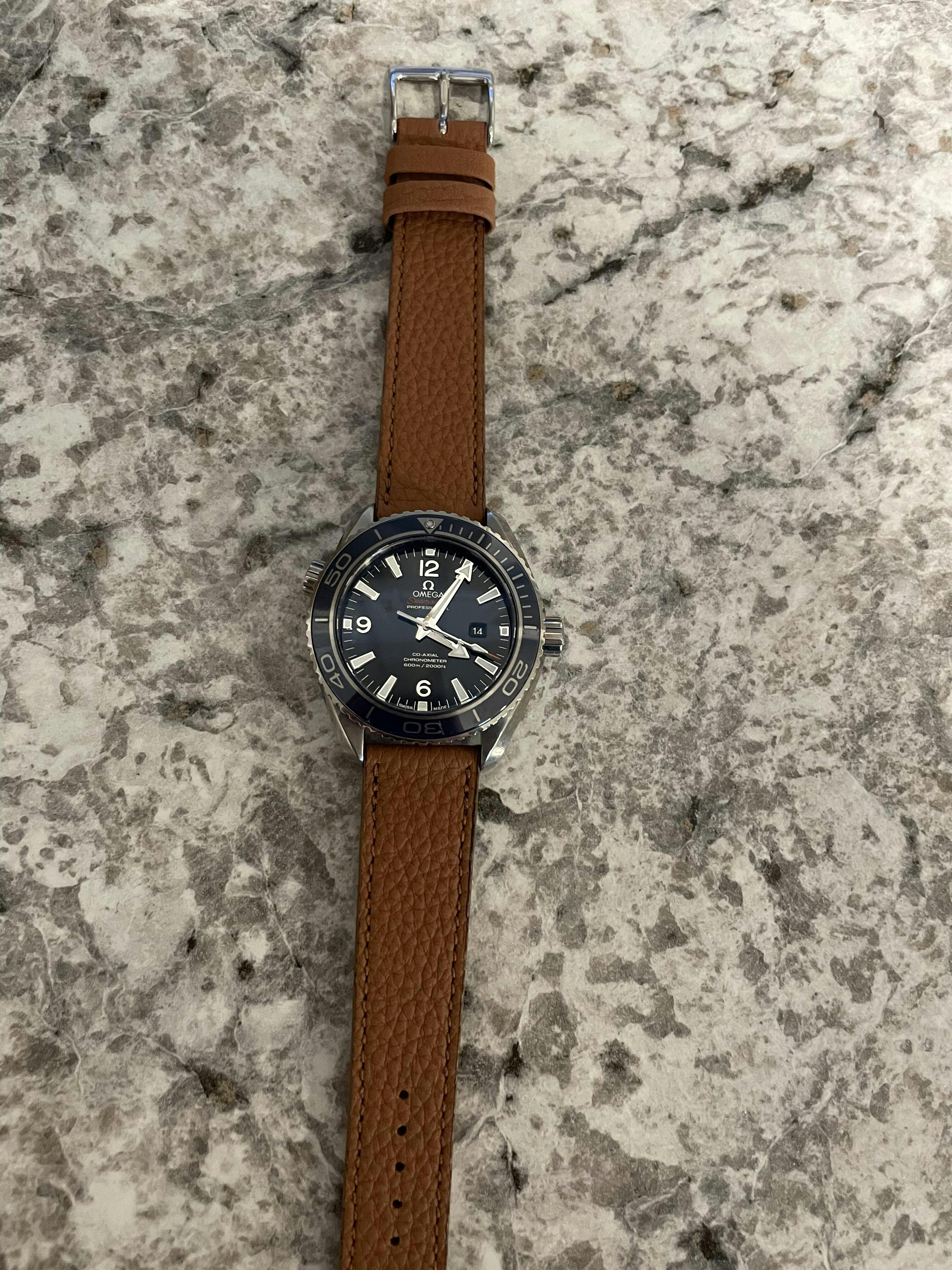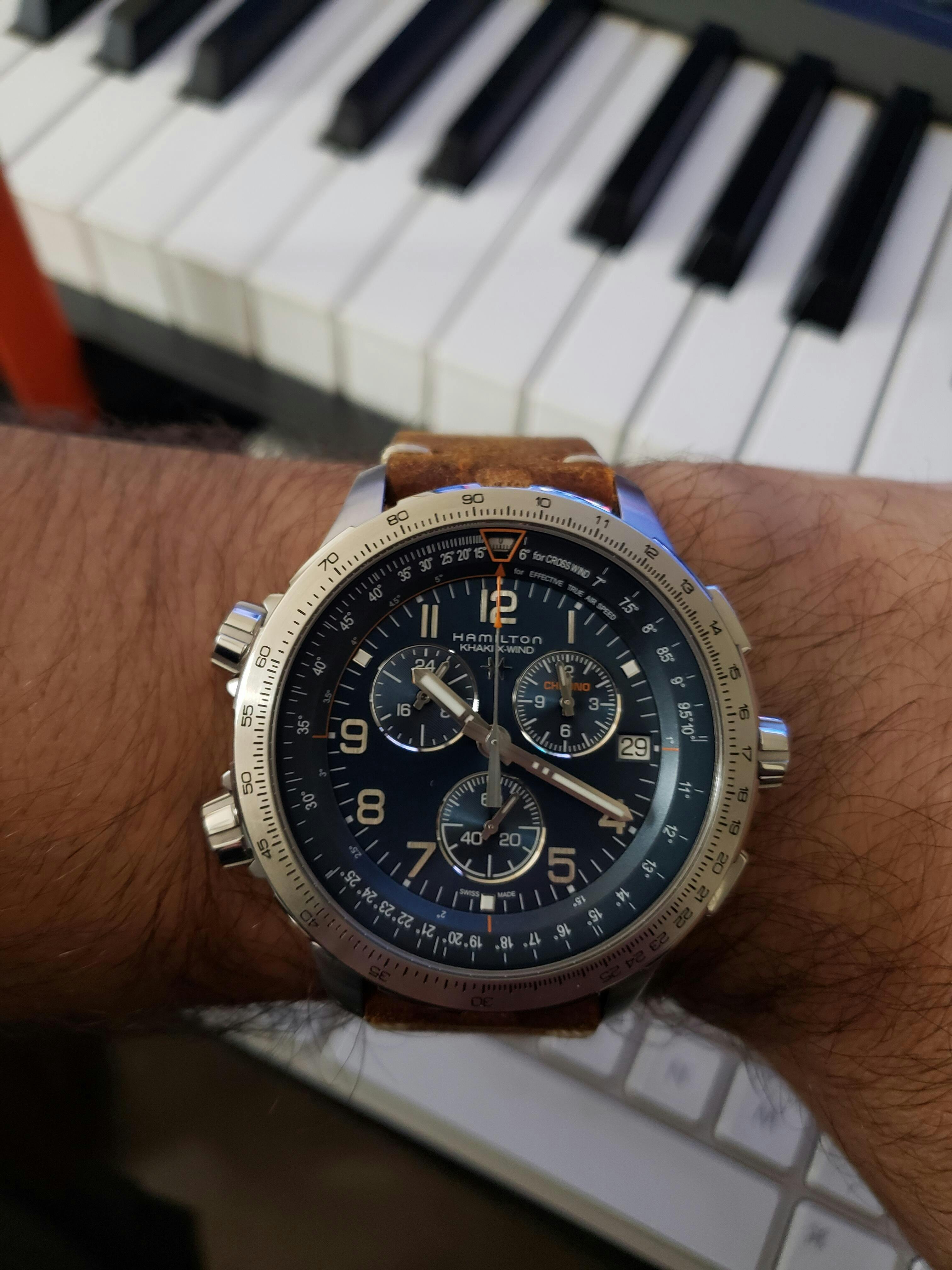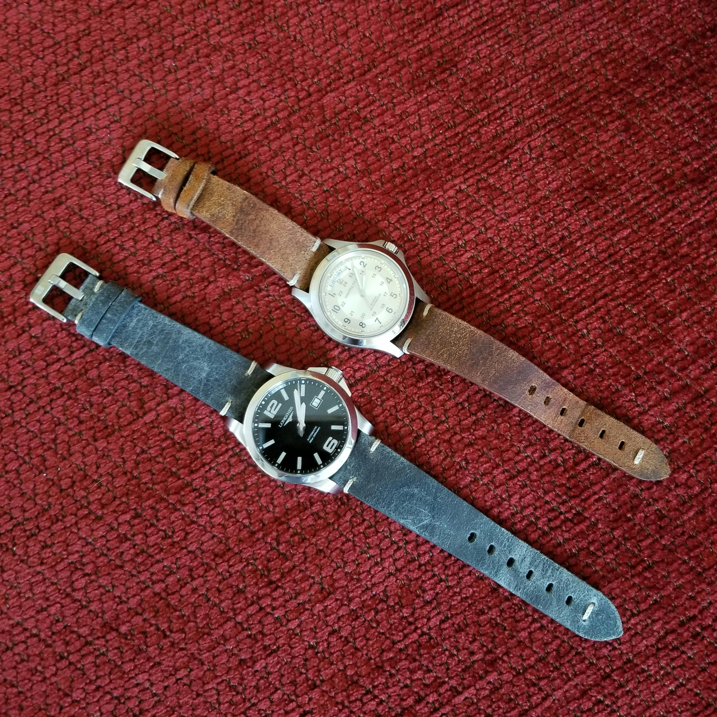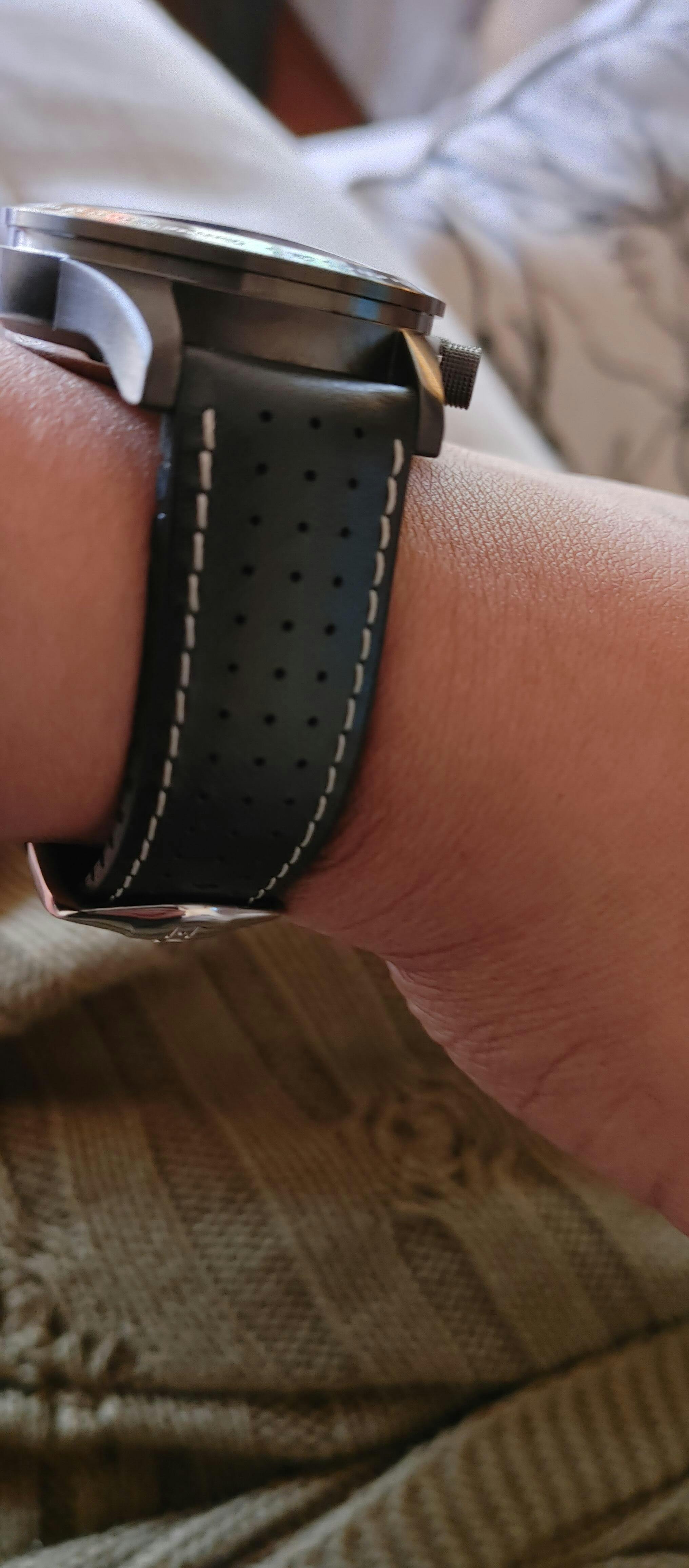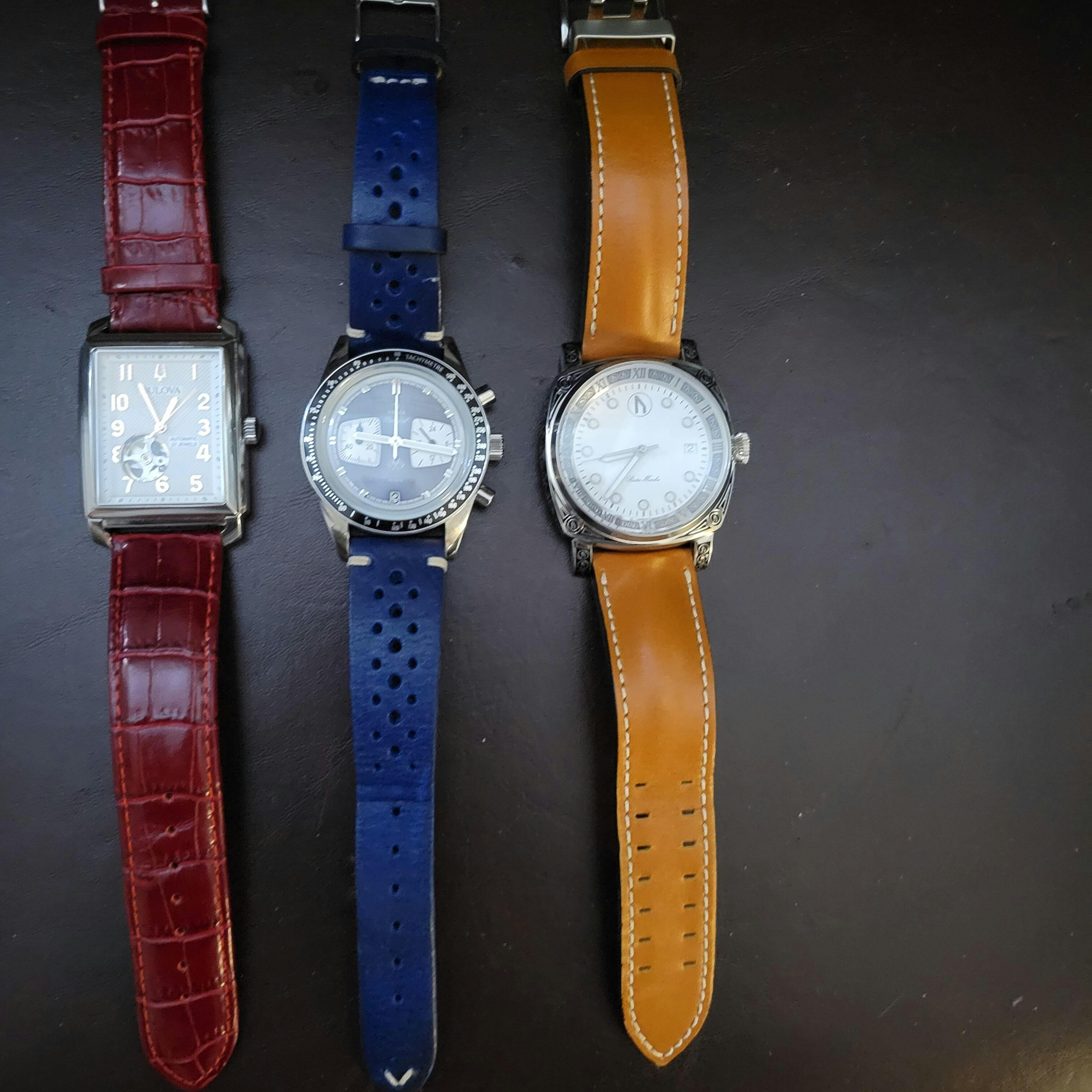 I will try to keep my review short- hard when I have so many good things to say! This review covers three straps I purchased all of which exceeded expectation and were perfect for the intended purpose. The Fluco Chiara burgundy was to change up straps on a Bulova Sutton rectangular automatic which came with a nice alligator embossed brown leather strap but the burgundy took it to another level. The Di-Modell tan was the perfect strap for an Ugly Rista Marka automatic which is kind of a cool, funky watch which has an etched case and needs a bold designed strap like this- perfect. The Fluco racing blue was for a Yema Ralygraf Blue Tarmac, which came with a very nice brown racing strap but the blue strap, again, takes it to another level- again, perfect. So, I couldn't be happier with the quality, price and straps that perform and fulfill a collector's imagination :) (Not a great night time photographer but pic attached)