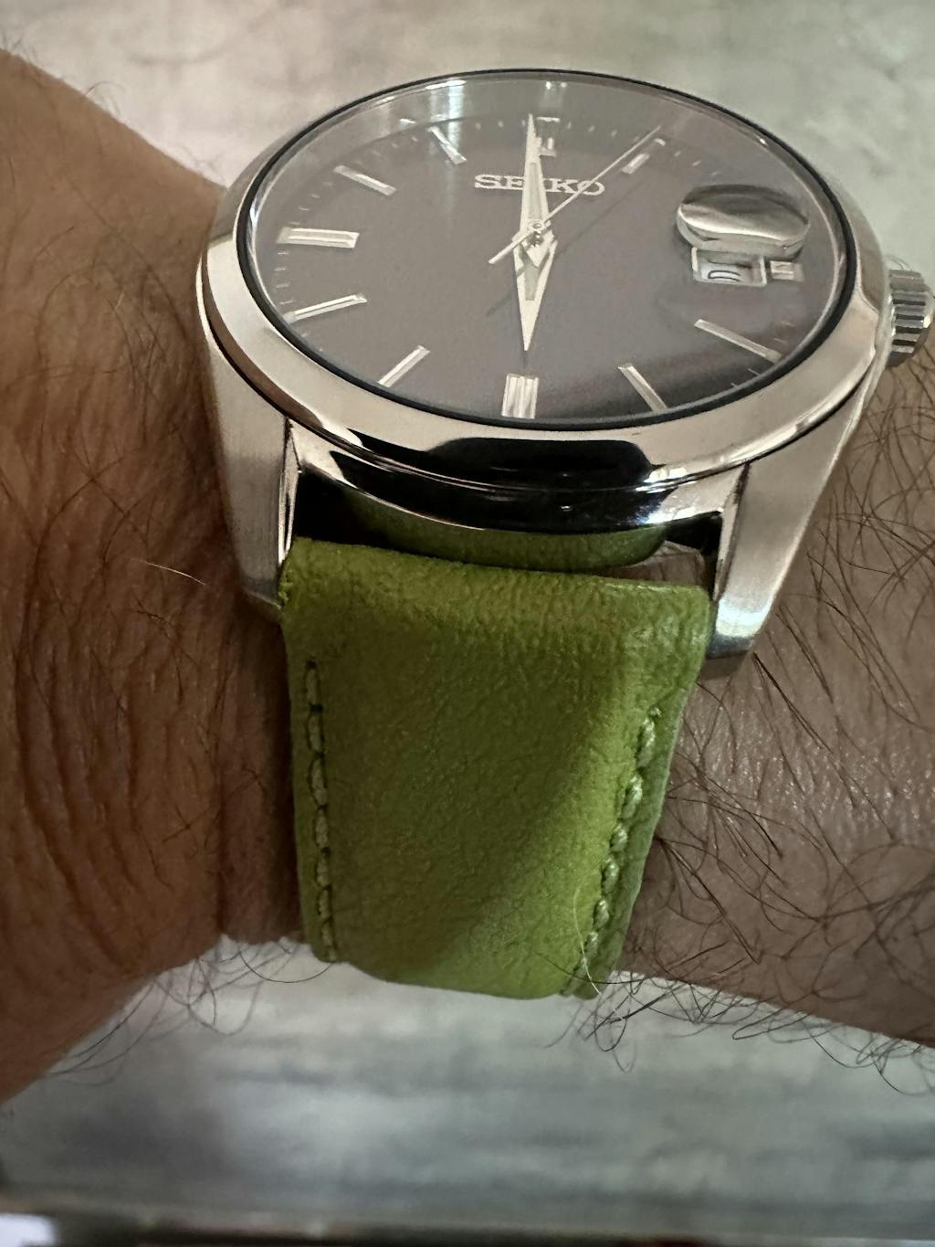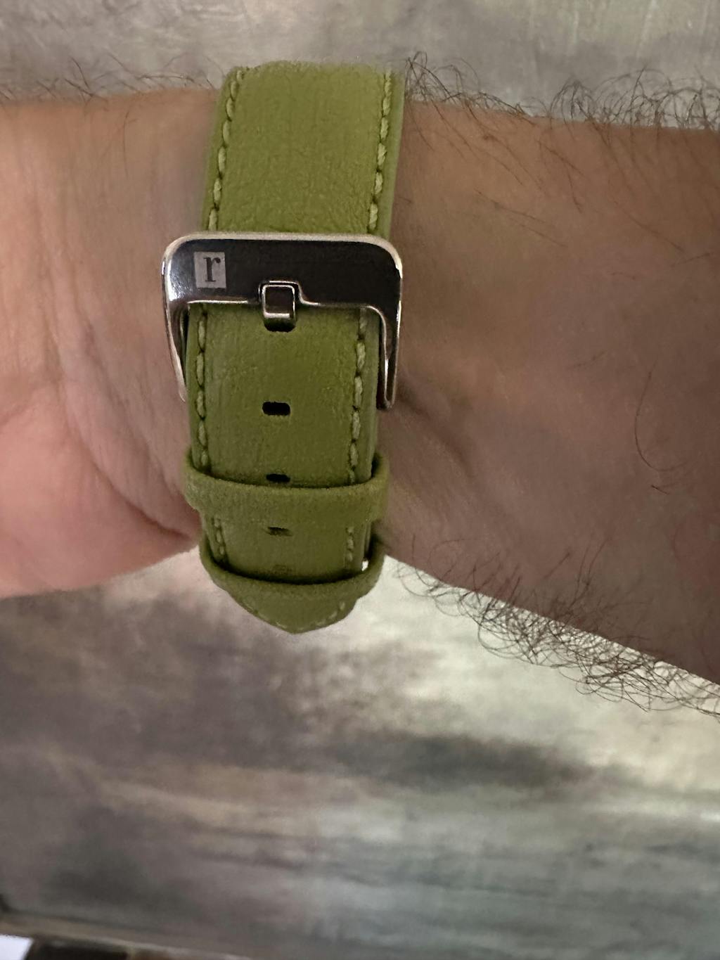 Thank you for expediting my order so quickly. I ordered my strap on Saturday and it arrived on Tuesday. My ColaReb Strapple is a vegan strap. The material is made from discarded apple membrane. The look, feel, grain, and texture are quite similar to calf leather. This vivid green strap pairs perfectly with my very pedestrian , inexpensive Seiko quartz. The watch is now the “Beautiful Beater”.
