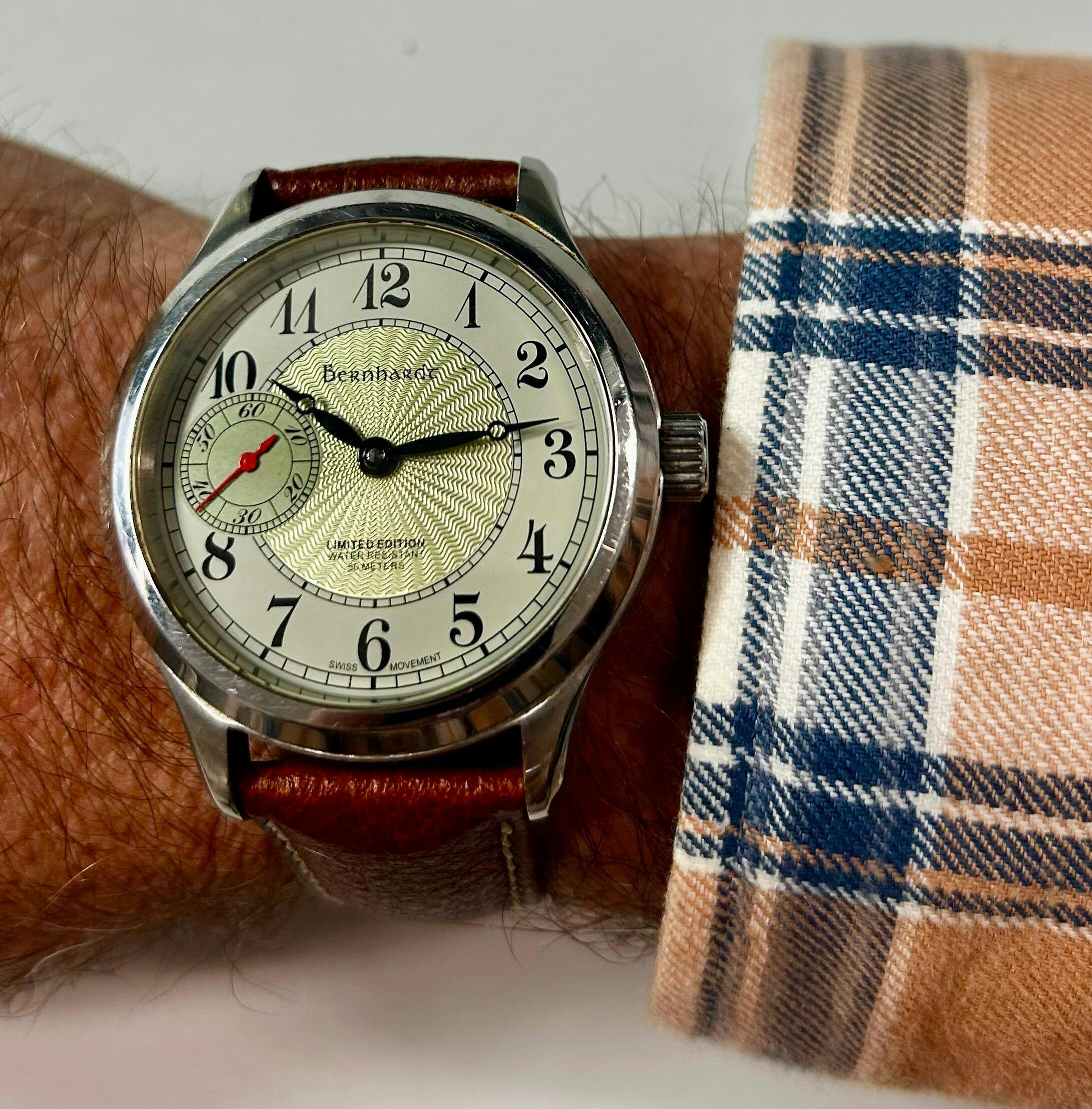 I bought this Boston Gold Brown buffalo leather strap for my Bernhardt Officer’s watch. I had a black strap on it, but didn’t like the look. This gold brown strap is perfect. It’s high quality leather, soft from the start with no break-in period required. The quick release spring bars make it a snap to change straps. It’s a great strap, you’ll like it!