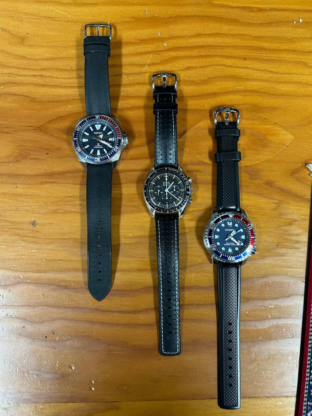 I have purchased a number of Hirsch quick release watch straps, mostly for older watches whose original straps or bracelets have worn out, or when the oem strap is terrible. Shown are three of my straps, all bought from Holben. The Citizen Eco-Drive diver is on a Hirsch Accent Black Rubber strap. The Omega Speedmaster chronograph (my father's watch) is on a Hirsch Tiger Performance black leather strap. Finally, the Seiko PADI diver is on a Hirsch Arne Performance Sailcloth black strap. I think they are great!