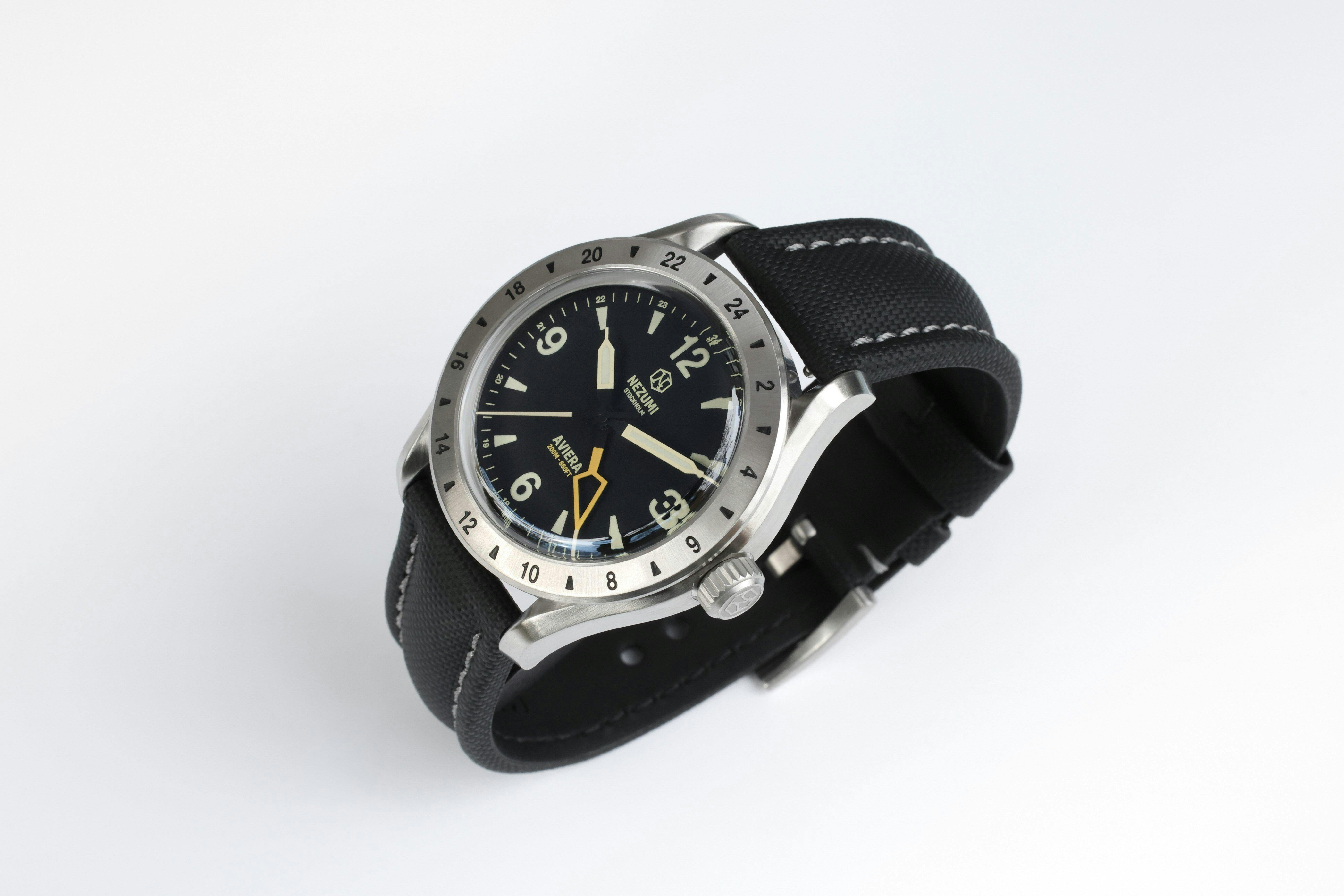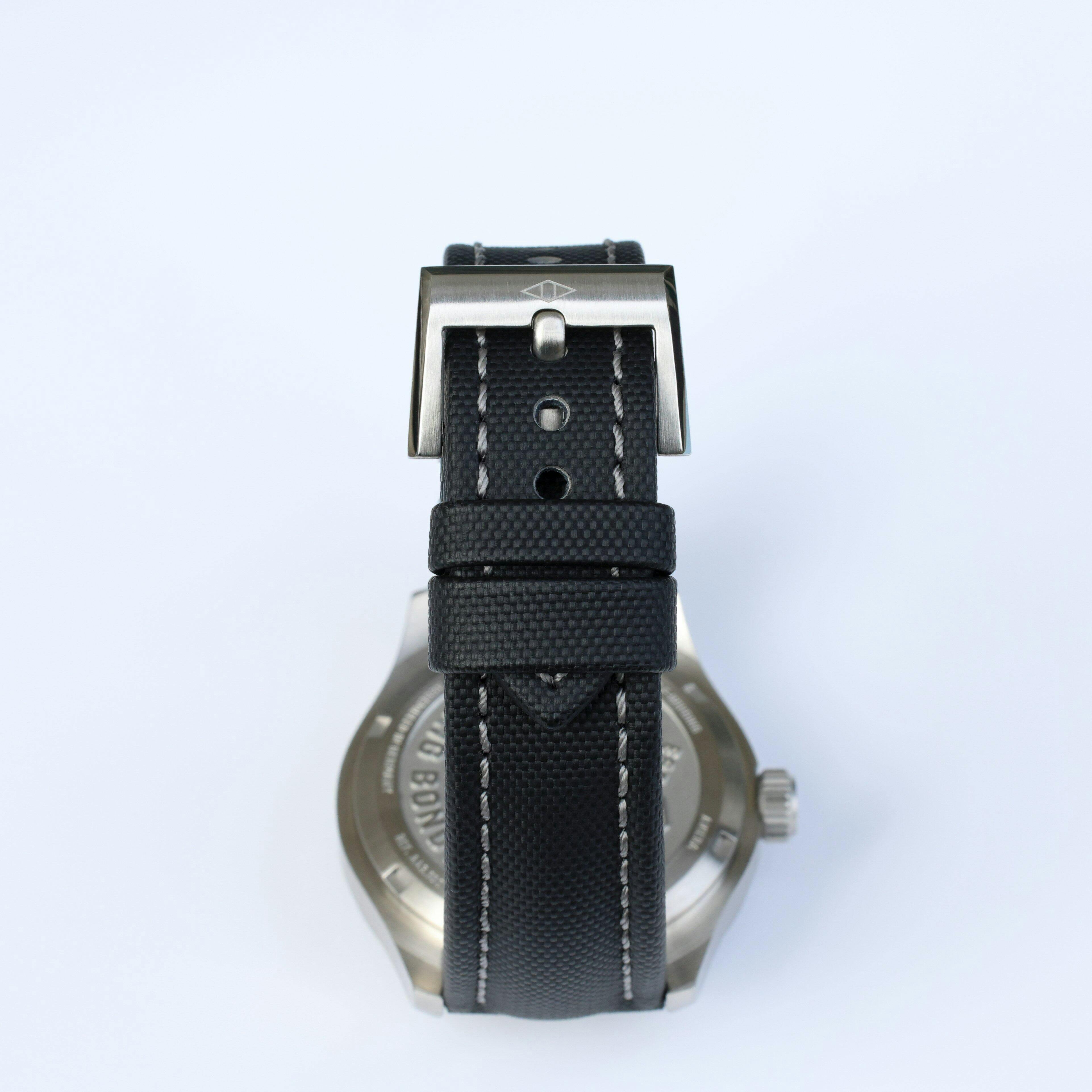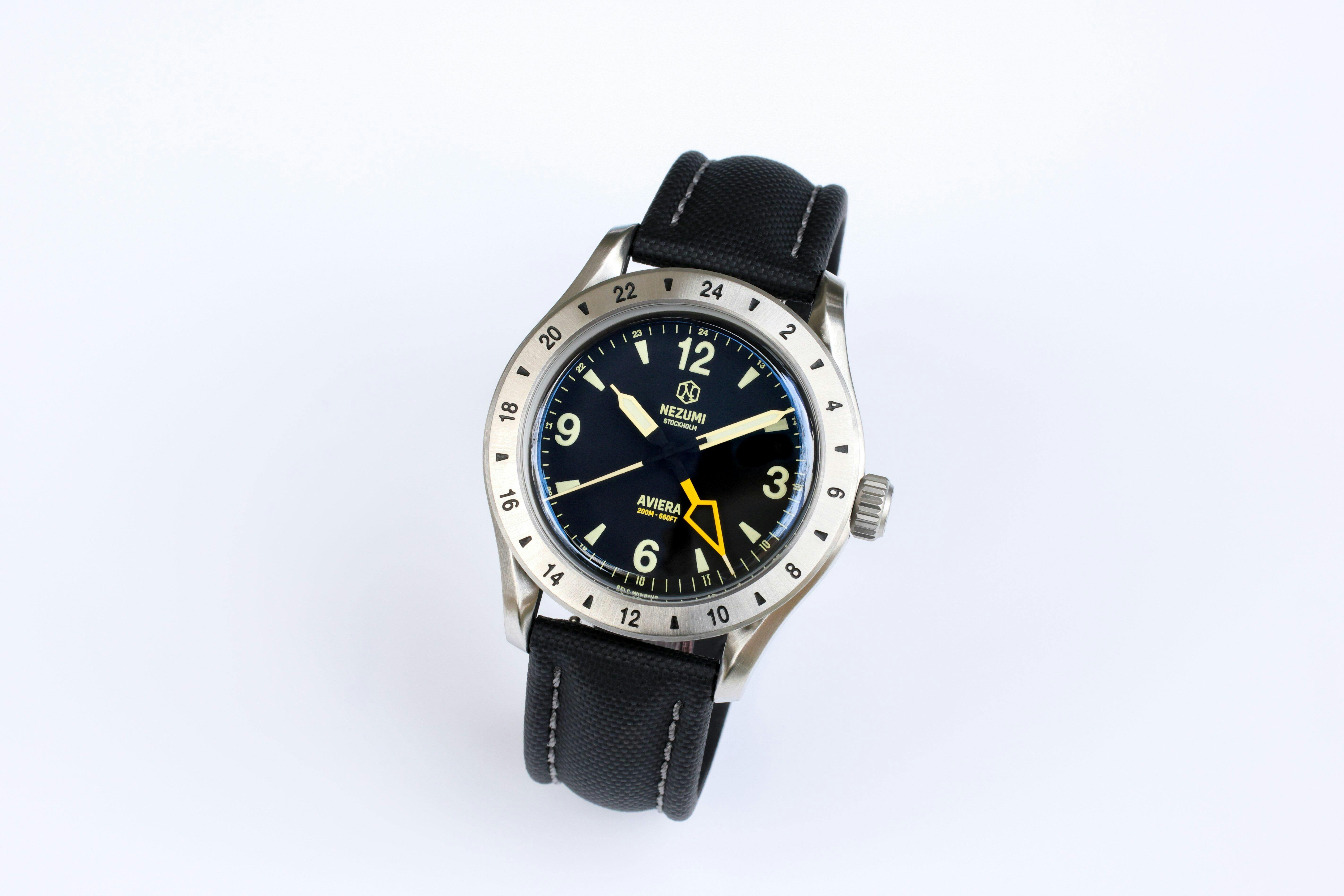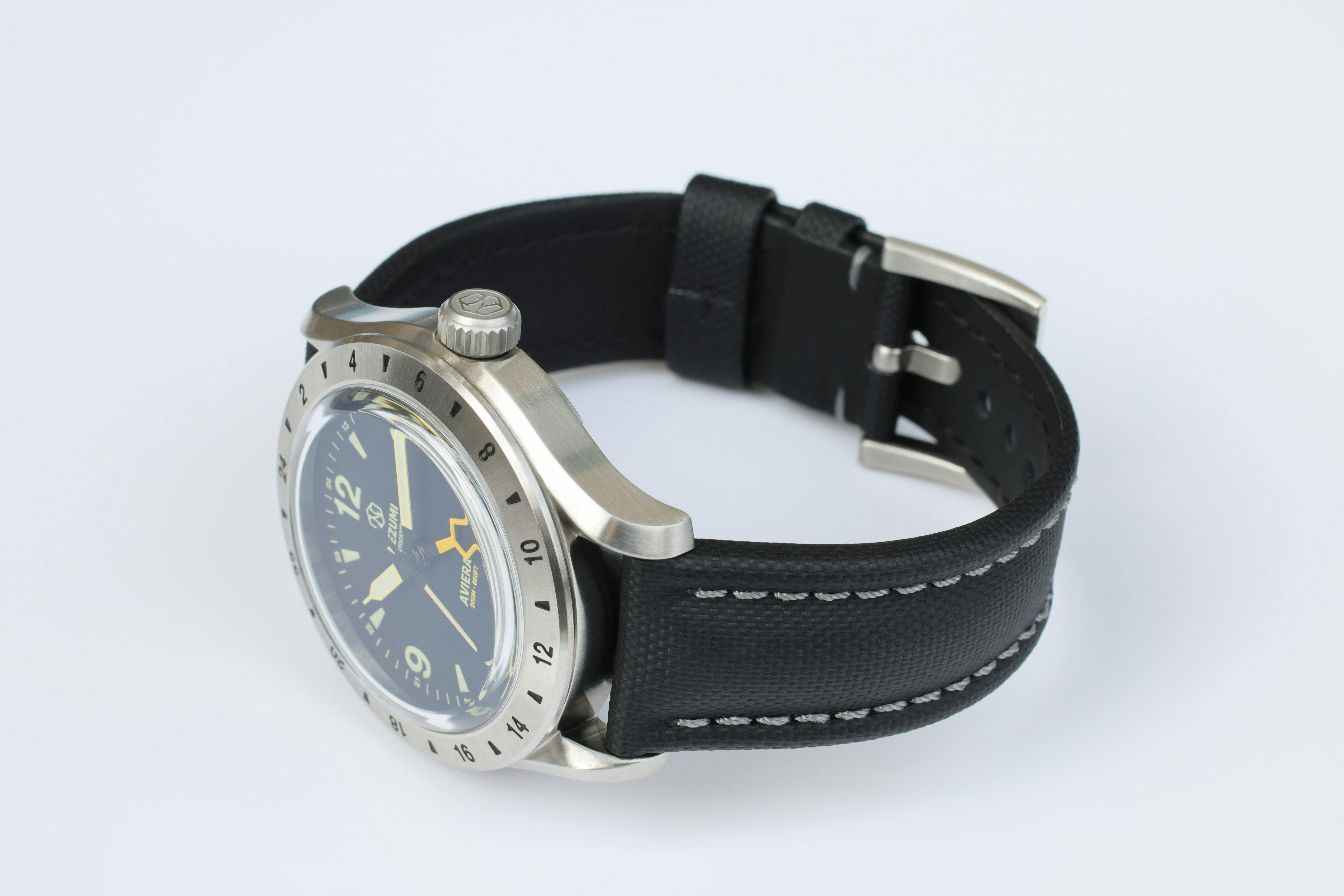 An Artem Classic Black Grey Stitch Sailcloth Watch Strap, fitted to an Nezumi Aviera GMT – Ref. AA3.102 wristwatch.
